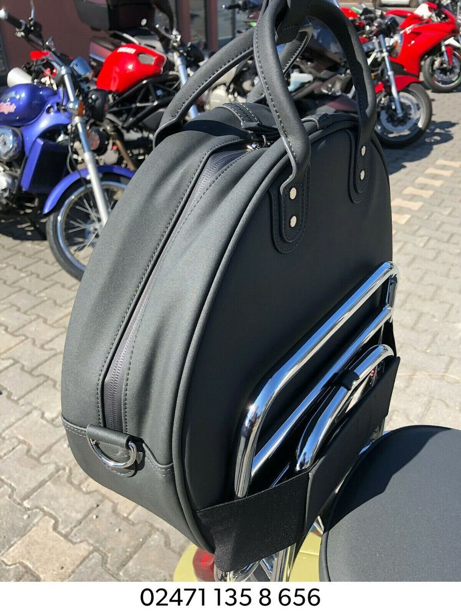 . Abnehmbare Hecktasche aus Nubukledern in Form eines Reserverads auf dem verchromten Klappgepäckträger